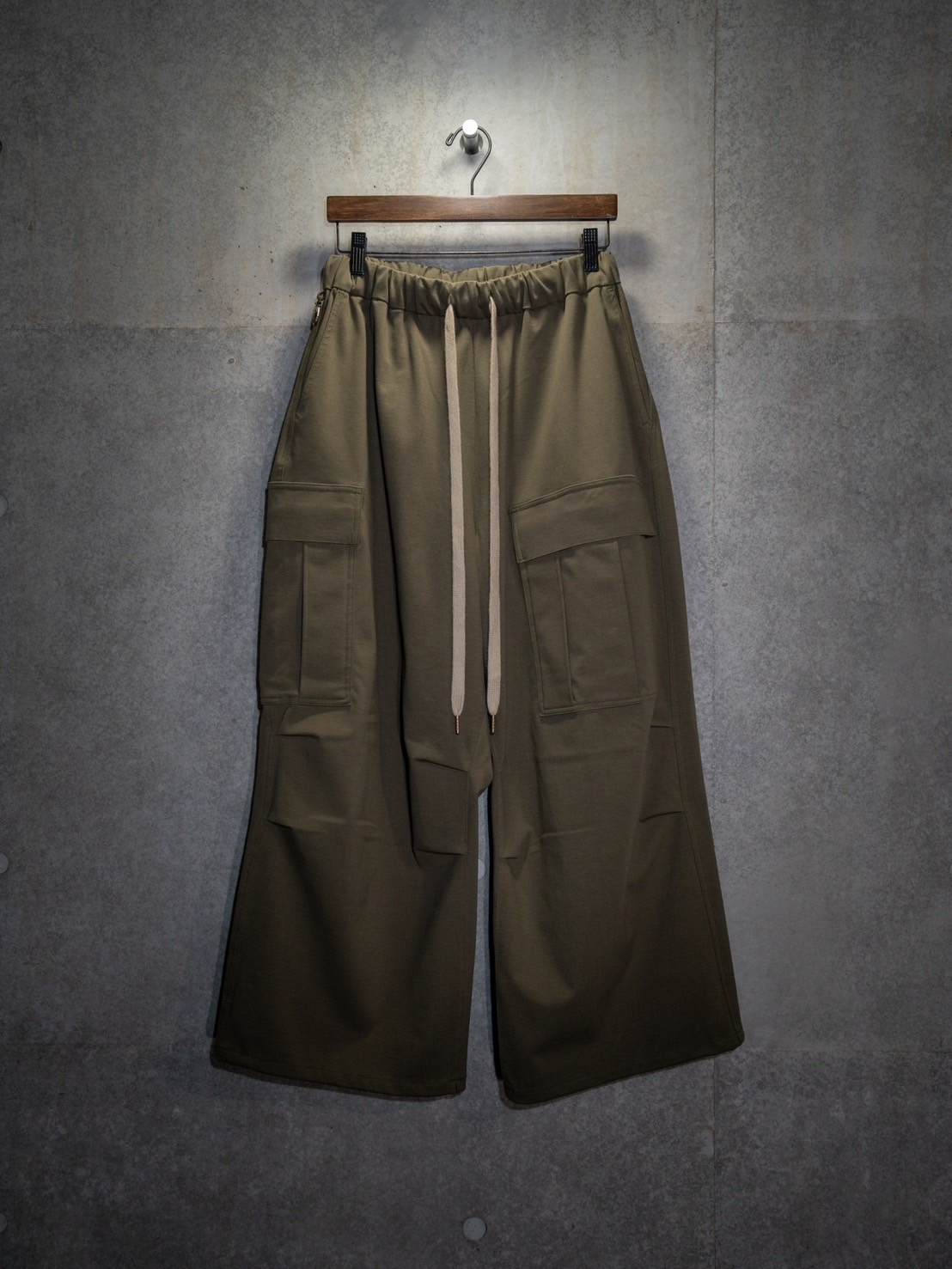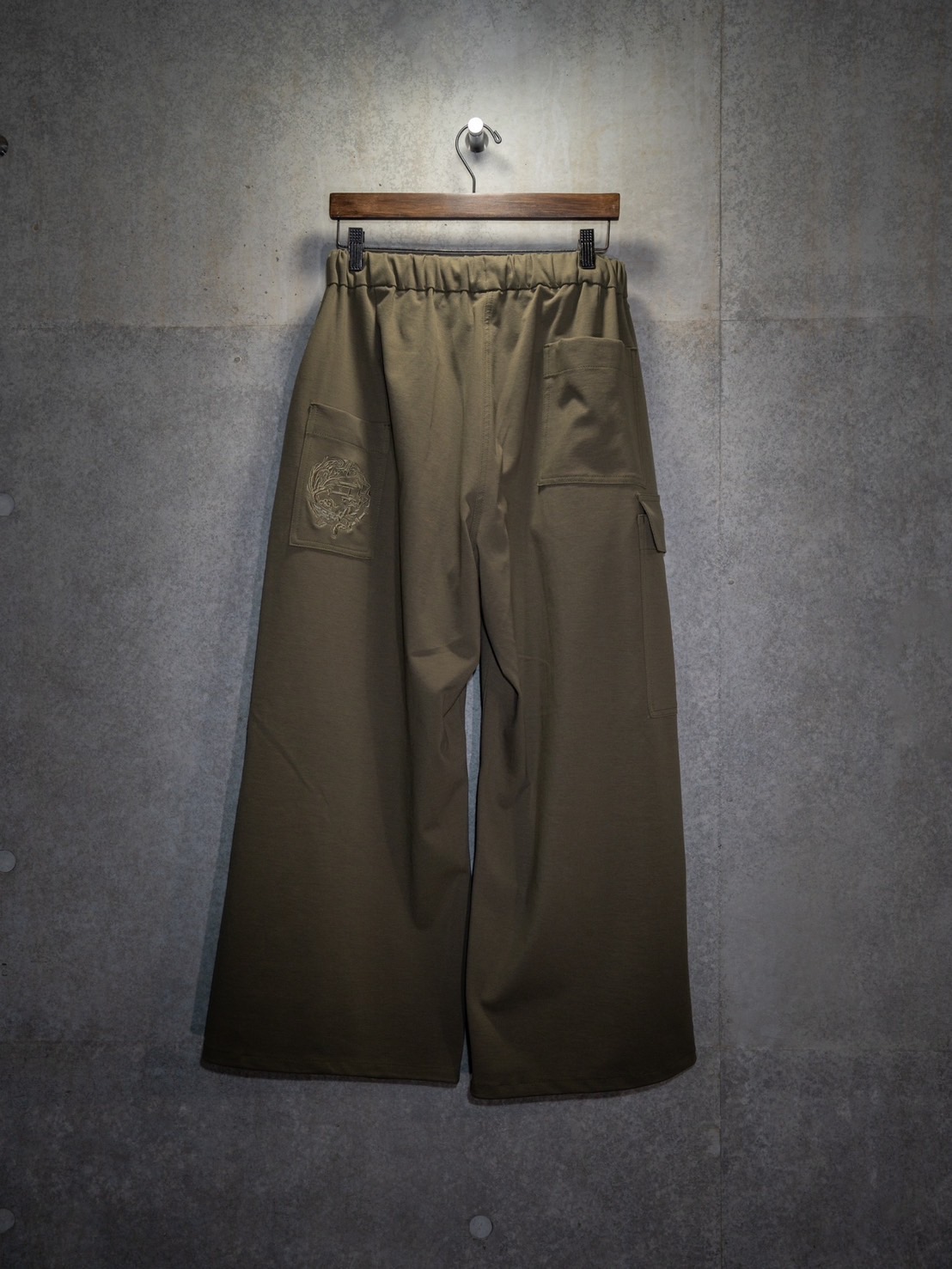 生地からこだわり、『広貨物洋袴』と同じくパターンやパーツまで妥協なしのスウェットパンツ 腰紐はパンツのアクセントとなるロングロープ 腰にはカラビナが備わっているためベルトループが無くとも鍵やキーホルダーなどが付けれます。 携帯が入れやすいポジションに専用ポケットがあり陸漆陸-弐式-のロゴが刺繍で入ってます。 パンツの裾には絞りがついているためお好みに合わせてシルエットが変更可能